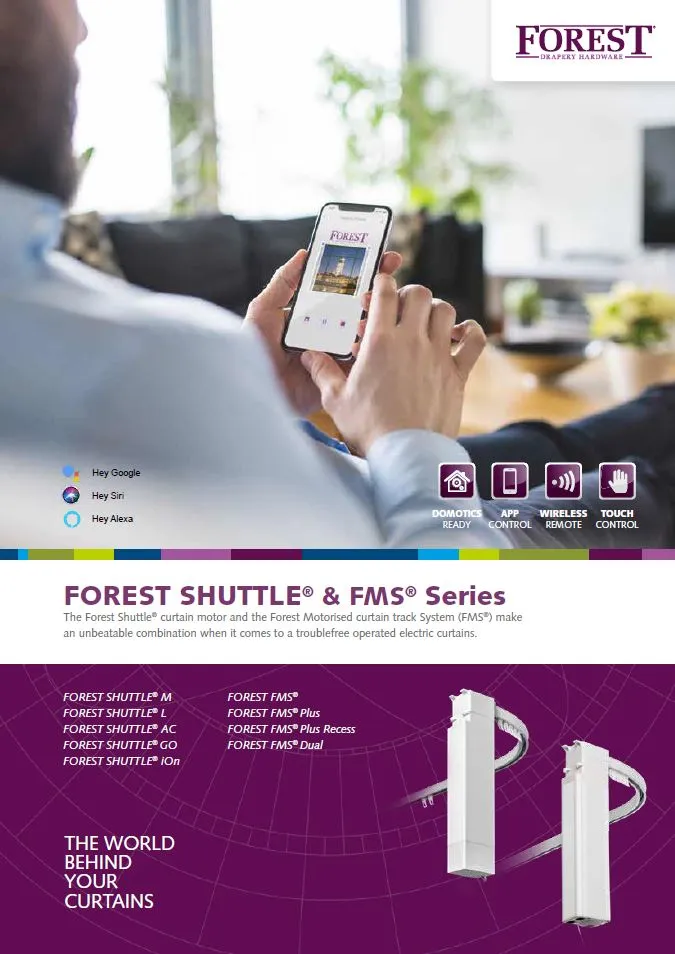 The electric FMS® track is powered by the reliable Forest Shuttle® curtain motor. All Shuttle® options are applicable for the FMS®, so there is always a solution to suit your situation.