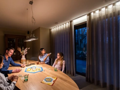 We kunnen ons voorstellen dat u niet direct een beeld heeft bij een gordijnrail met verlichting. Bekijk daarom de onderstaande afbeeldingen voor inspiratie. De foto’s laten goed zien hoe de verlichting de gordijnen een zachte, warme gloed geeft.