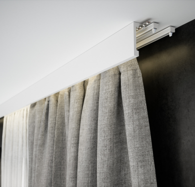 The Lightblocker® pelmet profile helps reduce light entering from the top while neatly concealing the curtain track, creating a clean and finished appearance. The profiles can easily be cut to the required length. If needed, profiles can be extended by filling the seams and applying a final finish. Installation is simple and can be done using a universal adhesive.