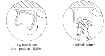 Installing the CKS is very easy using the Smart Klick wall or ceiling brackets. With these brackets, you simply click the rail into place. In addition, the Smart Klick carriers can be inserted into the track afterwards, without having to remove the track. Too many carriers? They can be just as easily removed using the Forest removal tool. This makes installation fast and user-friendly.
