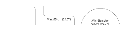 The rails can be bent in any direction with a minimum bend radius of 20 cm (7.9''). Continuous curves and circular shapes are possible with a minimum diameter of 50 cm (19.7''). Both inward and outward curves are possible with a radius of 20 cm (7.9'').