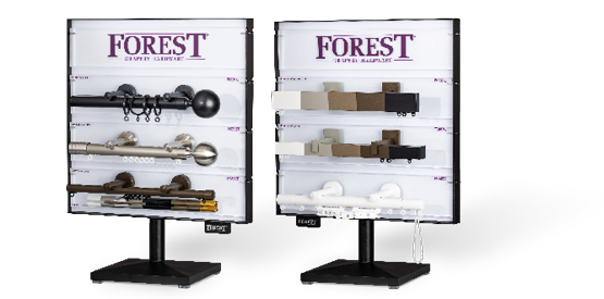 Speciaal voor onze roedecollectie (incl. CRS® Deco) hebben we een tafeldisplay ontwikkeld. Deze kunt u gemakkelijk in uw showroom zetten om onze roedecollectie aan uw klanten te laten zien. Deze unieke stijlvolle display toont in één oogopslag de diverse combinatie- en kleurmogelijkheden van de Forest gordijnroede systemen inclusief eindknoppen. De compacte display is een ware eyecatcher voor op toonbanken en tafels, bijvoorbeeld op beurzen of in de showroom. De CRS® display is inclusief roedes en kleurstalen.