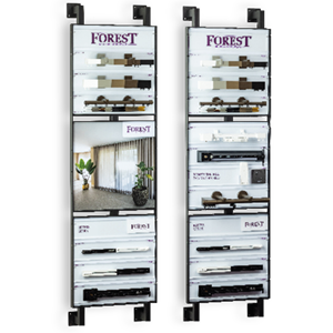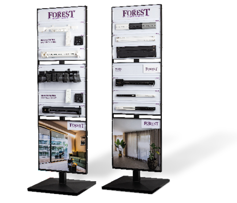 De draaibare tafeldisplay is een compacte en flexibele oplossing voor het presenteren van een selectie Forest systemen. Dankzij de losse bordjes stelt u de inhoud eenvoudig zelf samen en past u deze moeiteloos aan. Door de draaifunctie bekijken klanten de producten vanuit elke hoek. De display biedt ruimte voor zes systemen.