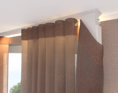 For the most elegant result, install the DS-XL® LED with ceiling brackets so the track fits seamlessly against the ceiling. Combine it with our FES system for wave pleat to create a beautifully uniform look. We also recommend using lighter, thinner fabrics to let the light gently shine through.